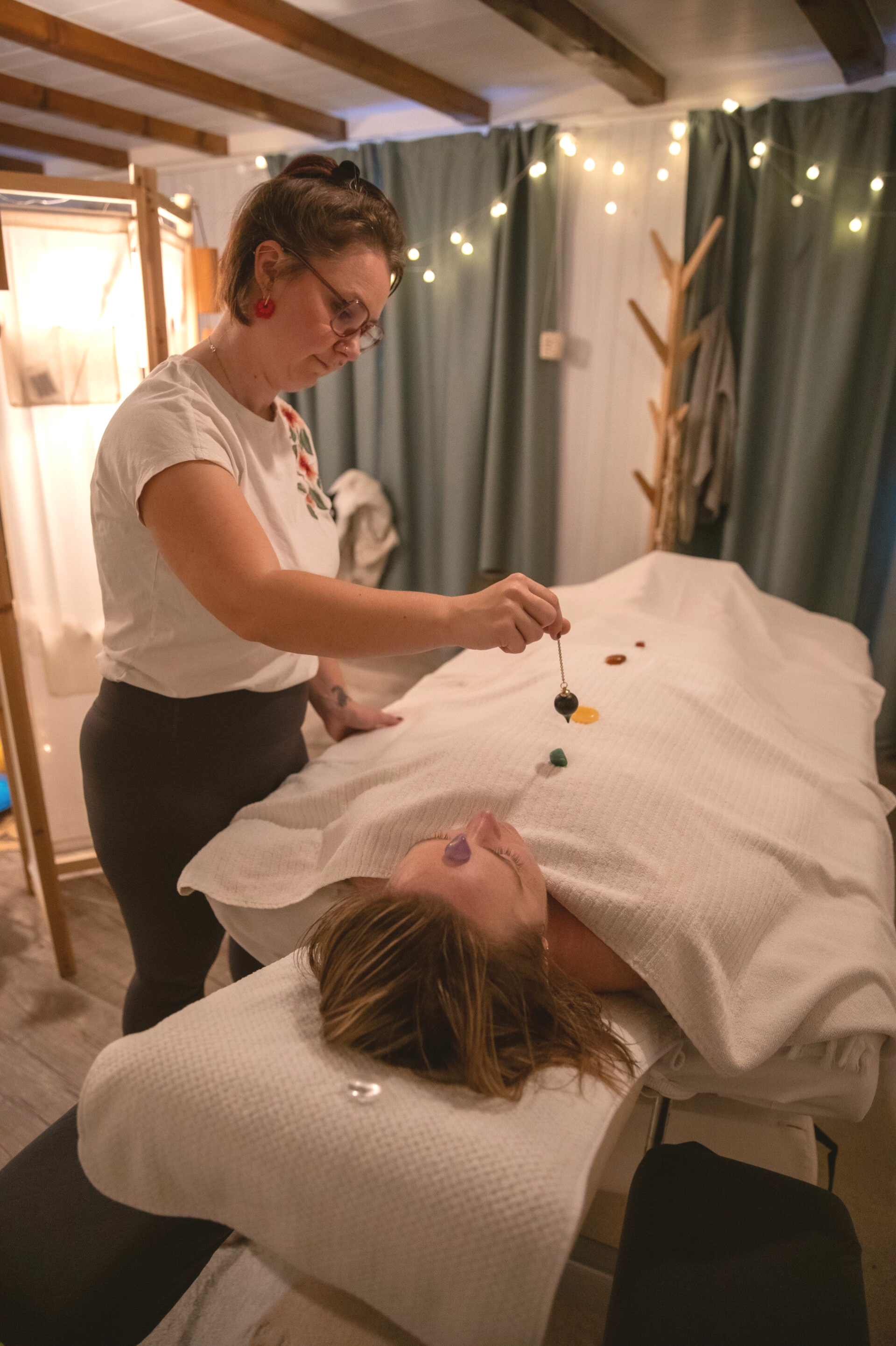 En fin de massage, je propose un soin des chakras également avec l'aide de pierres spécifiques à chaque chakra. J'utilise mon pendule pour m'aider à les harmoniser et les aligner.